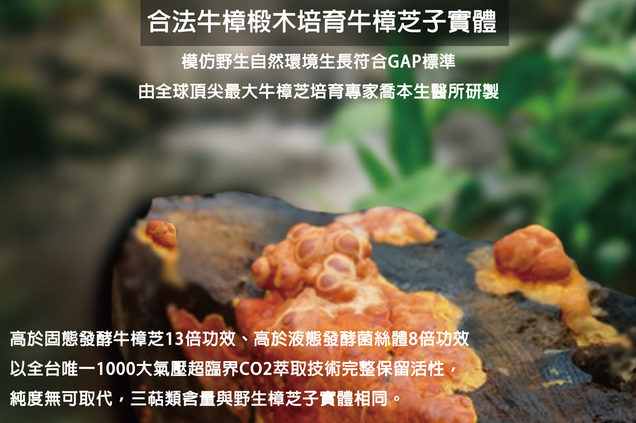 模仿自然野生環境,以合法天然牛樟椴木培育之牛樟芝子實體萃取,滋補強身,提升保護。